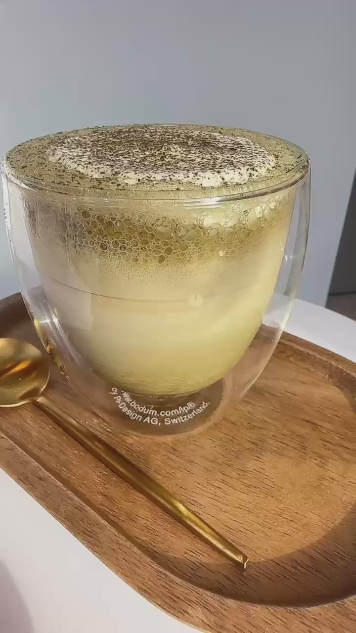 Visually, the contrast between the warm brown of the hojicha and the golden hue of the kinako creates an aesthetically pleasing and inviting drink, providing a delightful flavour experience.